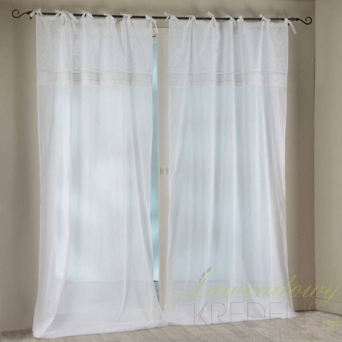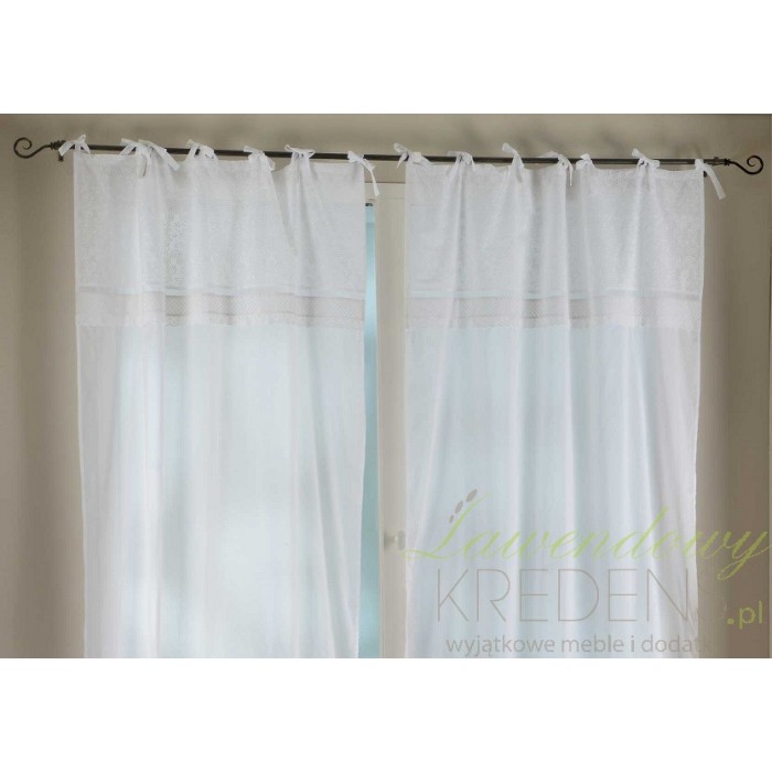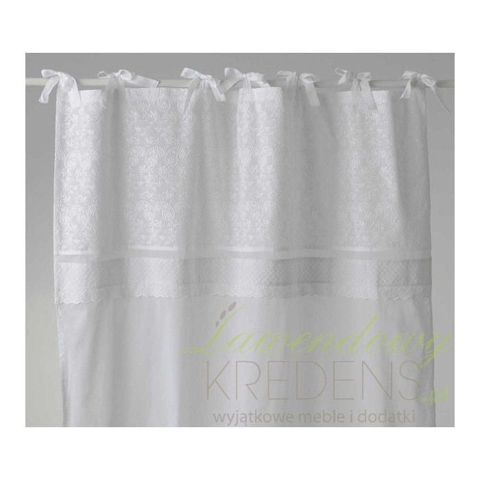Zasłona prowansalska ma śliczny biały kolor i wykonana jest w stu procentach z bawełny. Jest duża i zawieszona na uroczych niewielkich ozdobnych kokardkach. Posiada przepiękny wzór, który można podziwiać całymi dniami. Zasłony w stylu prowansalskim to doskonały wybór!