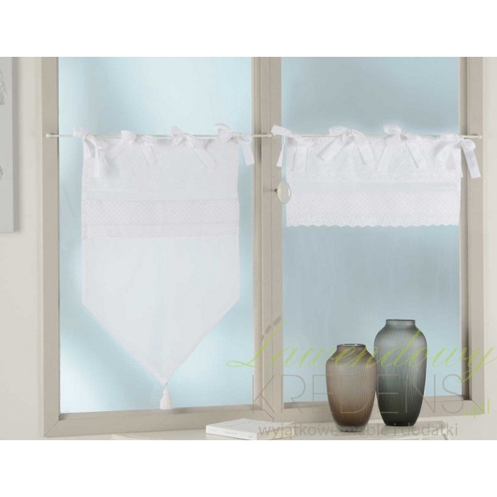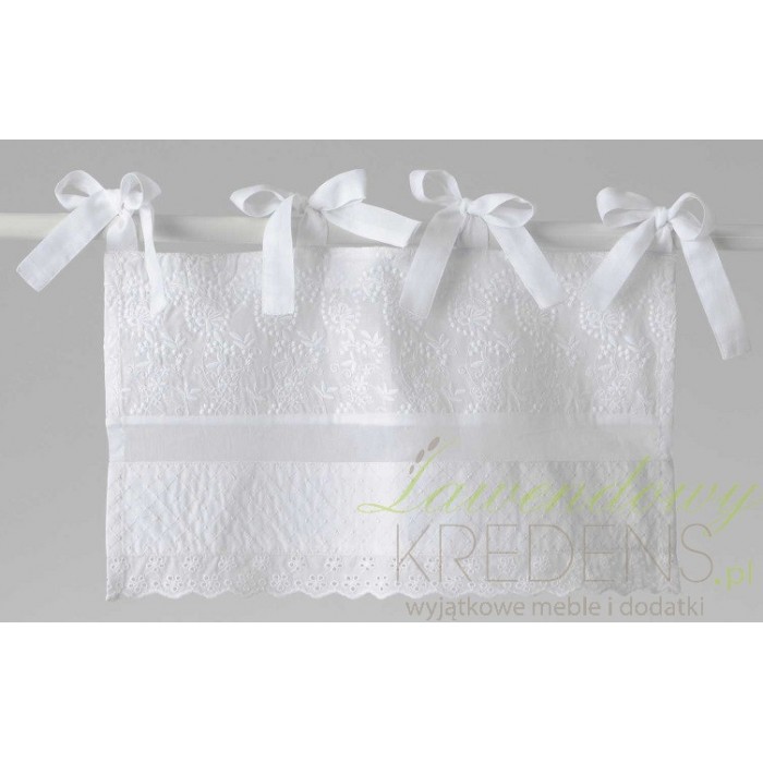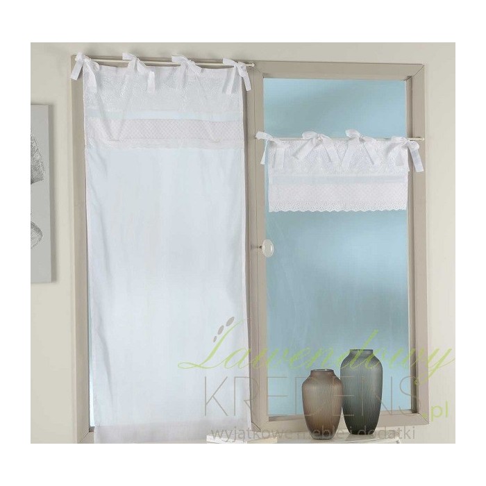 Zazdrostka prowansalska wykonana jest w stu procentach z przewiewnej bawełny. Ma biały kolor i delikatny oraz fantazyjny wzór. Biała zazdrostka u dołu zakończona jest falującą linią, a u góry ma dekoracyjne białe kokardki. Zazdrostki w stylu prowansalskim to wysokiej klasy materiał połączony z cudownym wyglądem.