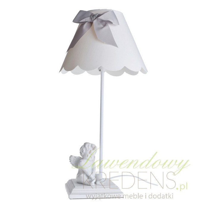 Lampka nocna w białym kolorze, mająca kwadratową podstawę na której umieszczona została figurka aniołka. Ta lampka prowansalska ma także dekoracyjnie wykonany jasny abażur na którym widoczna jest także szara kokarda.