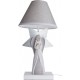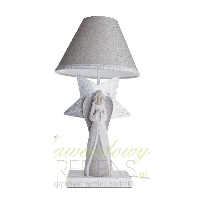 Dekoracyjna lampka prowansalska z ozdobnym aniołkiem z błyszczącymi skrzydełkami. Beżowy abażur o klasycznym kształcie udekorowany jest cienkim paskiem białej koronki. Lampka została wykonana z dbałością o każdy detal. Idealnie nadaje się do oświetlenia salonu, sypialni i pokoju dziecięcego.