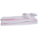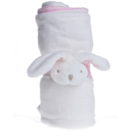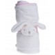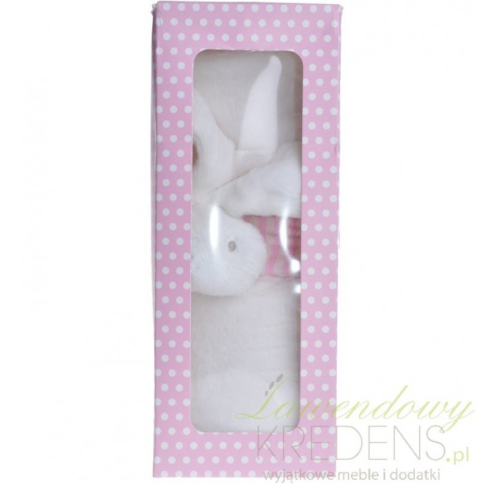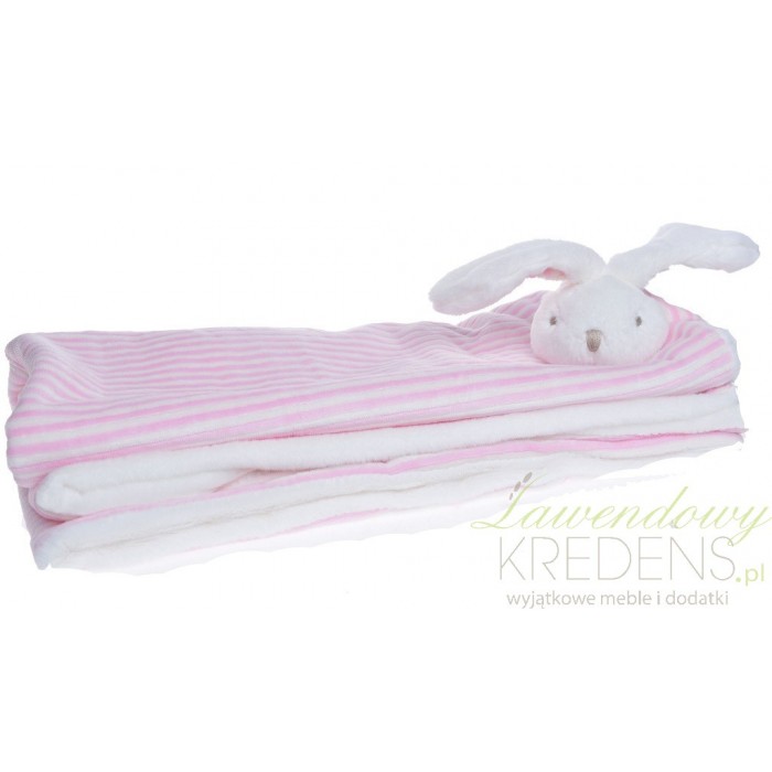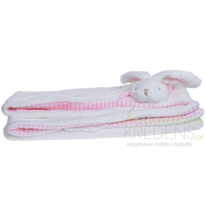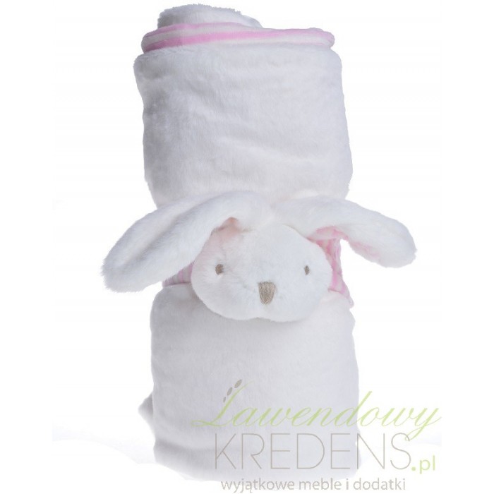 Uroczy kocyk dziecięcy z króliczkiem, w biało-różowym kolorze to wspaniały dodatek do pokoju dziecięcego, który został zapakowany w ozdobne pudełeczko.