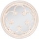 Okrągłe lustro w stylu prowansalskim ma beżową, rzeźbioną na francuski styl ramę z drewna.