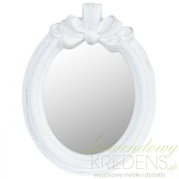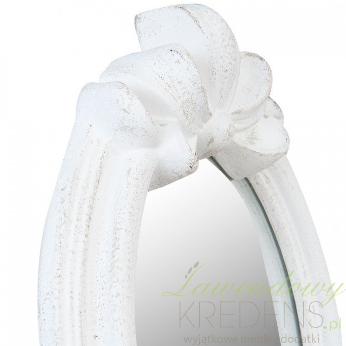 Dokonaj najlepszego wyboru i zamów lustro powansalskie do swojego wnętrza. Lustro jest owalne, a jego jasny kolor sprawia, że może być zestawione z wieloma aranżacjami. Delikatne przecierki dodają mu uroku, podobnie jak duża, rzeźbiona kokarda. Lustra w stylu prowansalskim polecamy do łazienek, do salonów oraz do przedpokoi.