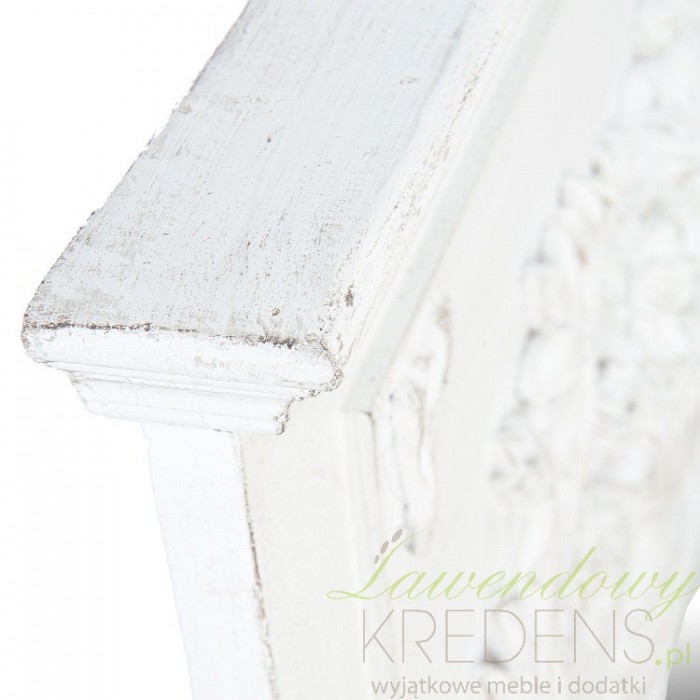 Drewniane lustro prowansalskie zdobione kwiatami ma kształt prostokąta i kolor antycznej bieli.
