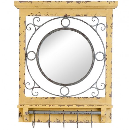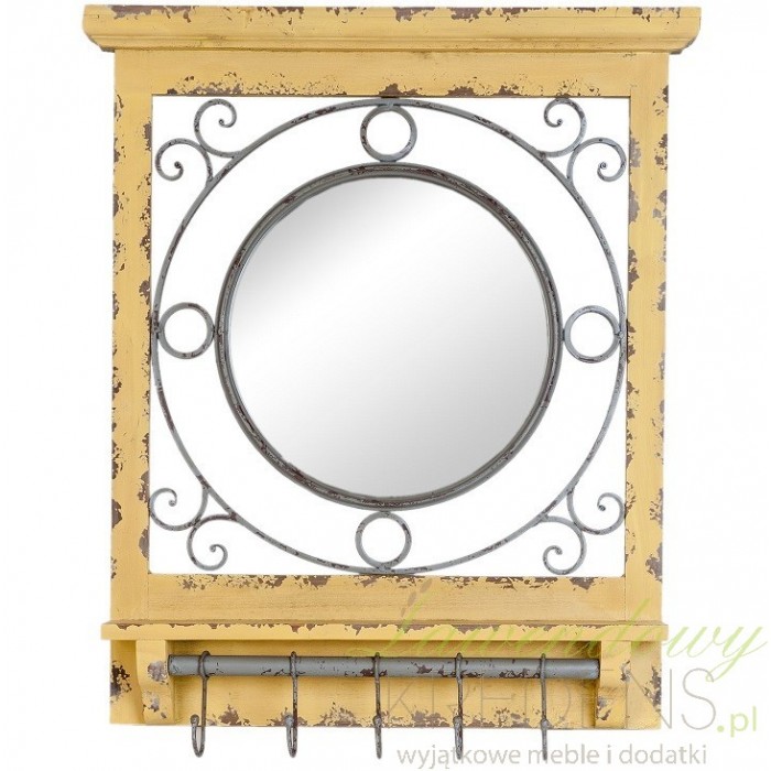 Lustro z wieszakami w stylu prowansalskim to energetyzujący akcent do każdego wnętrza. Wyrazisty, żółty kolor drewnianej ramy z postarzeniami to oprawa dla okrągłego lustra z metalowym obramowaniem. U dołu prostokątnej ramy zawieszono na drążku pięć haczyków, idealnych do wieszania niezbyt ciężkich części garderoby lub ściereczek kuchennych. Marzysz aby Twoje wnętrze nawet w pochmurne dni tworzyło radosny klimat? To lustro niewątpliwie zostało stworzone właśnie dla Ciebie.