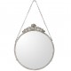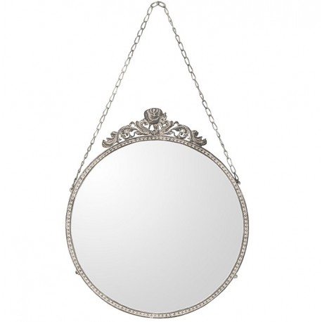 Piękne lustro w stylu prowansalskim o średnicy 30cm możesz powiesić na ścianie za pomocą łańcuszka. Całość wykonana w stonowanej, szarej kolorystyce.