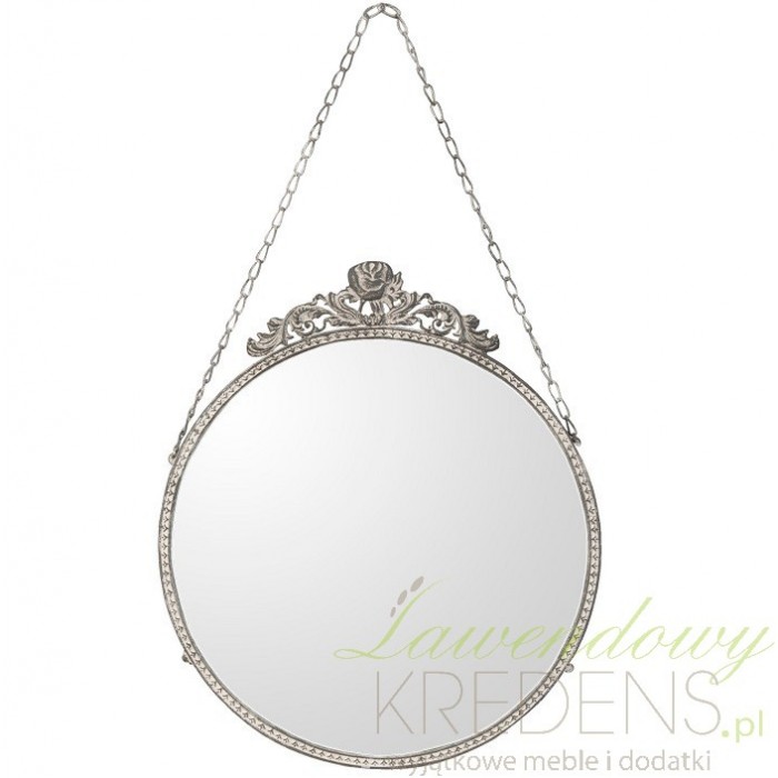 Okrągłe lustro prowansalskie zawieszone na łańcuszku z ciekawie zdobioną ramką. W górnej części lustra znajduje się charakterystyczne zdobienie, podkreślające jego szlachetny styl. Jest doskonałym przykładem wyszukanej i oryginalnej formy. Powieszone na ścianie w salonie, łazience czy też w przedpokoju napawa pomieszczenie niepowtarzalnym stylem.