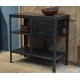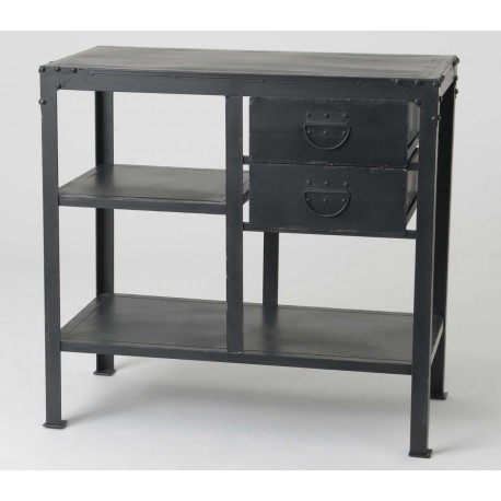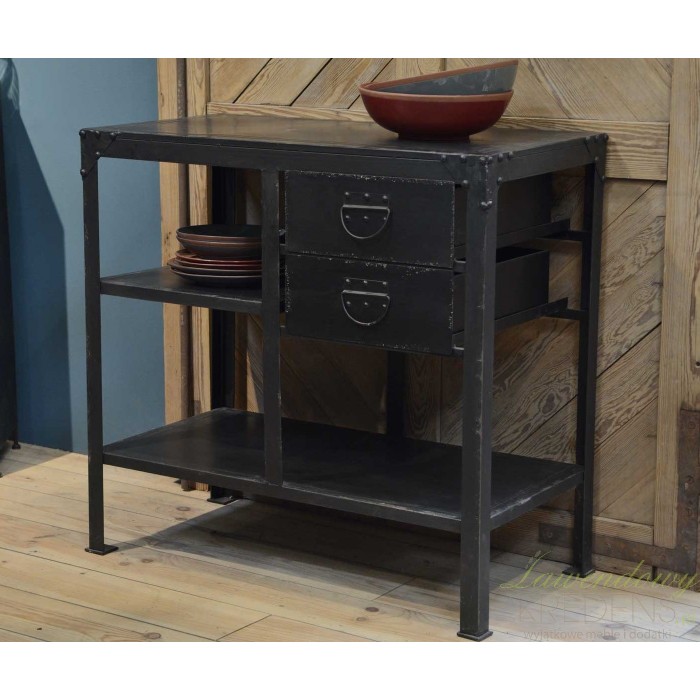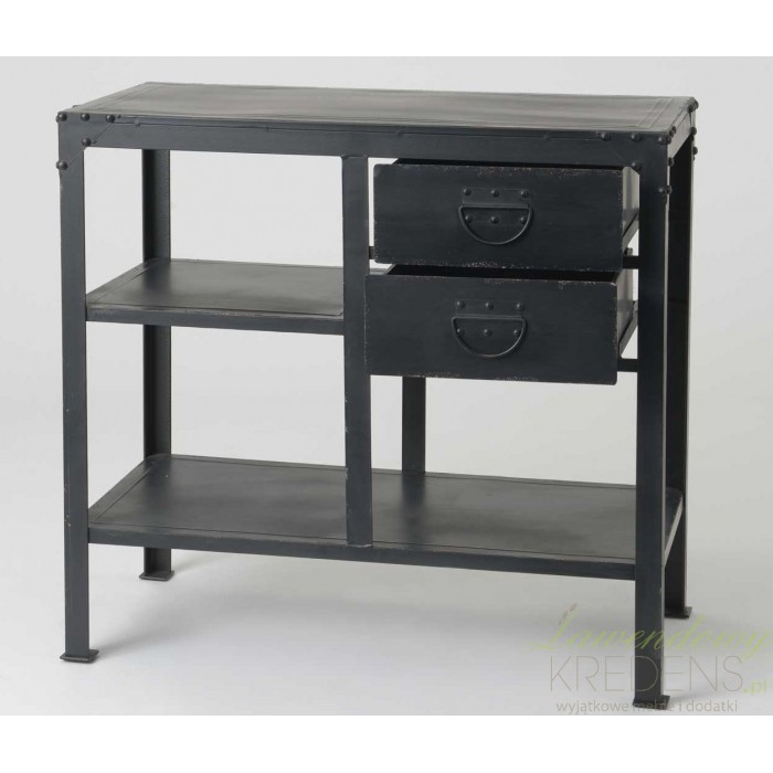 Komoda w stylu industrialnym to czarny, metalowy mebel posiadający dwie praktyczne szuflady i dwie otwarte półki.