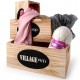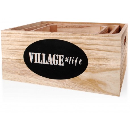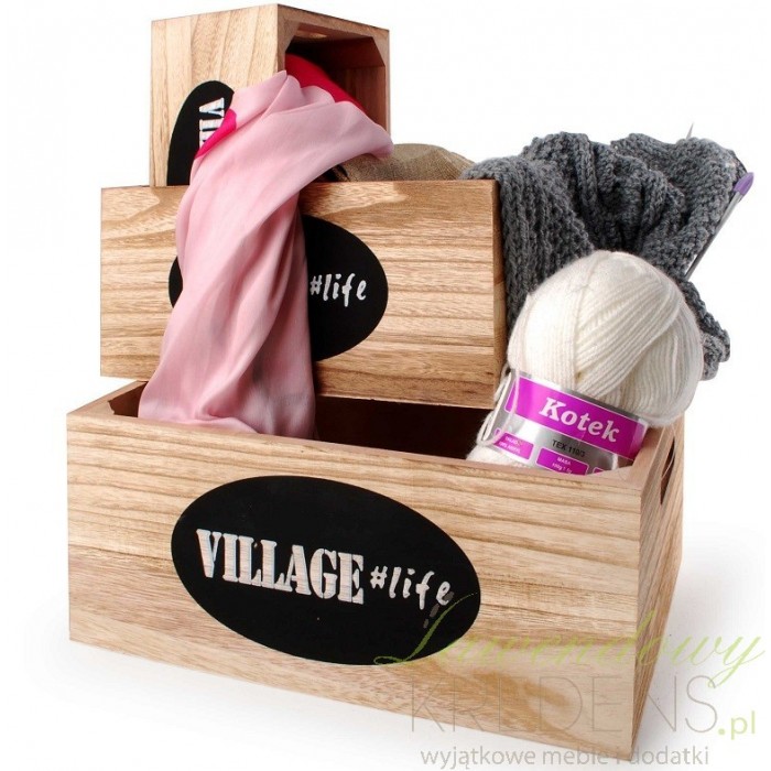 Skrzynki drewniane to wspaniała dekoracja prowansalska, która pełni również ważną praktyczną funkcję. Drewniane skrzynki mają jasny kolor i są w liczbie trzech sztuk i w różnych rozmiarach. Z przodu znajduje się na czarnym tle biały angielski napis Village Life.