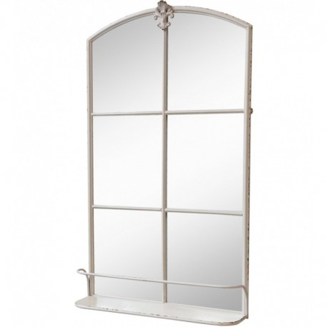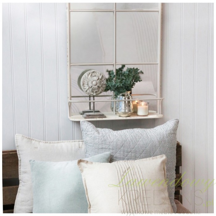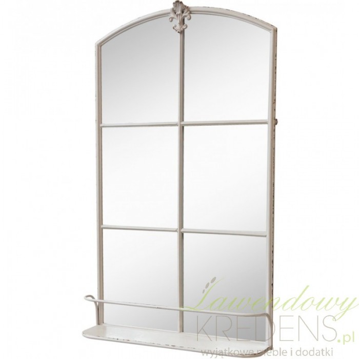 Wyjątkowe lustro okno nawiązujące do stylu prowansalskiego ozdobione zostało metalową ramą z ciekawym rzeźbieniem u góry i półeczką w kremowym kolorze.