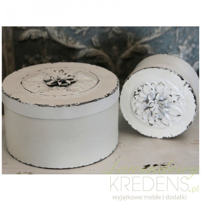 Okrągłe, metalowe pudełko o średnicy 20 centymetrów z przykrywką. To dzięki czemu pudełko jest wyjątkowe to liczne przetarcia i ozdoba w kształcie wypukłego kwiatu na wieczku. To świetny pomysł na praktyczny i jednocześnie piękny prezent. Pudełko Chic Antique doskonale nadaje się do przechowywania drobiazgów takich jak biżuteria, ale również torebek z herbatą i kosmetyków.