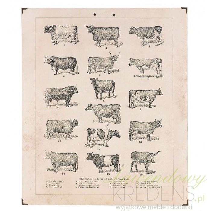Prostokątny obraz retro z krowami i bykami wygląda na stary, ponieważ wykonany jest na poszarzałym tle i ma delikatne przebarwienia na całej powierzchni. Na obrazie znajdują się byki i krowy wyglądające jak naszkicowane ołówkiem. Każde ze zwierząt ma przypisany numer, którego objaśnienie znajduje się u dołu obrazu. Obrazy w stylu retro to doskonały sposób na ozdobę ściany nie tylko w domu.