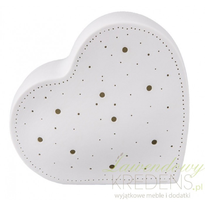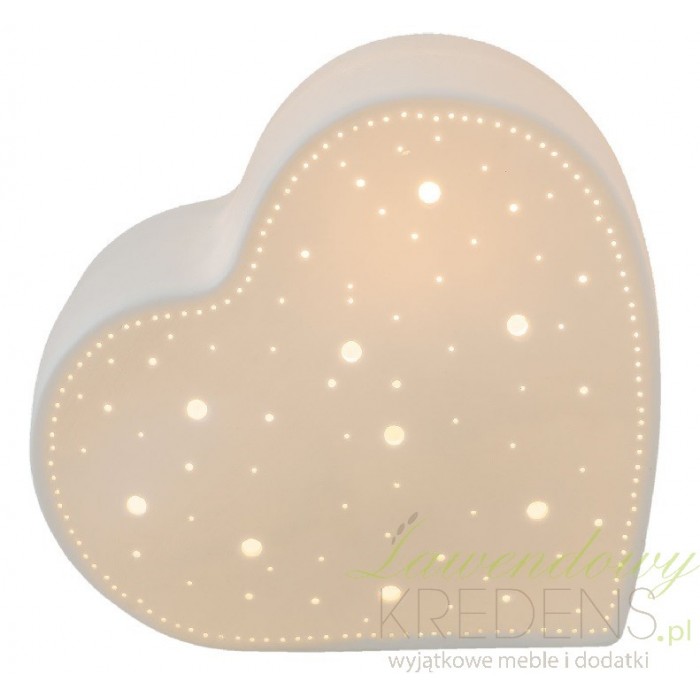 Lampka dziecięca w białym kolorze ma kształt serca a w nim widocznych jest kilka otworów w różnych rozmiarach. Pełna miłości i blasku lampka nocna wykonana z porcelany to dodatek do wielu pomieszczeń. Lampki dziecięce Clayre & Eef, to solidne i ciekawe wykończenie a także piękny kształt.