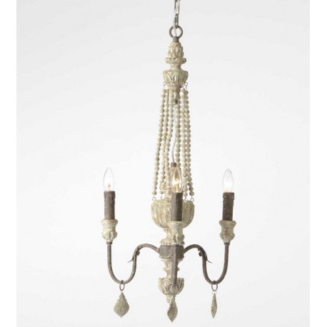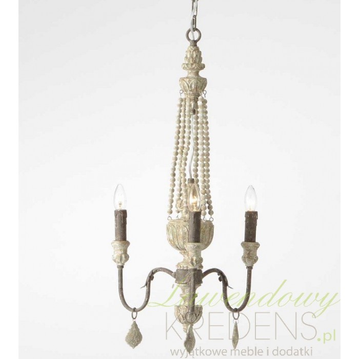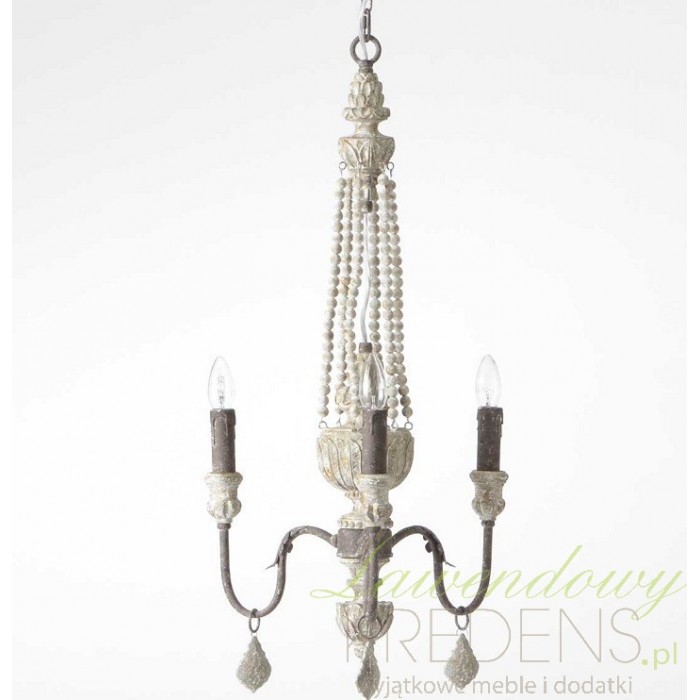 Duży żyrandol prowansalski swoja budową przypomina kształt stożka ze ścianami wykonanymi z jasnych koralików nałożonych na długie sznury.