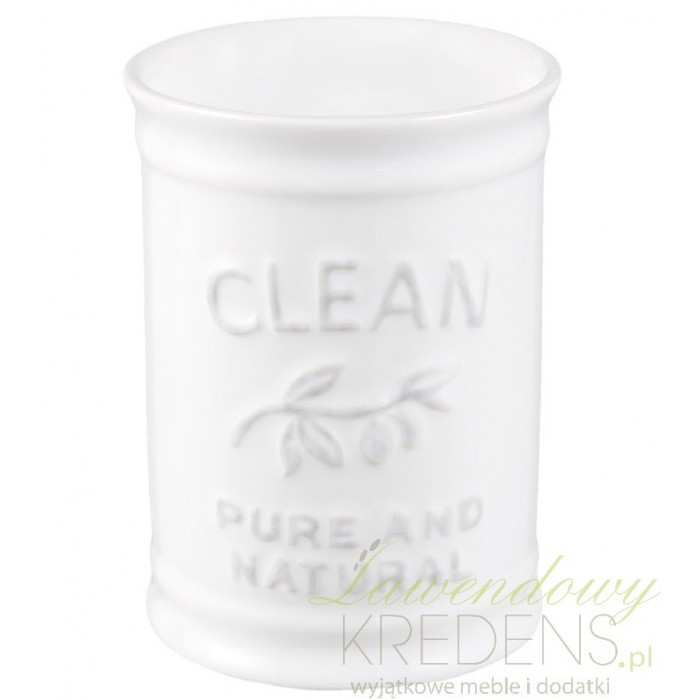 Ciekawy, biały i okrągły kubek łazienkowy firmy Clayre & Eef z kolekcji Clean z ozdobnym angielskim napisem!