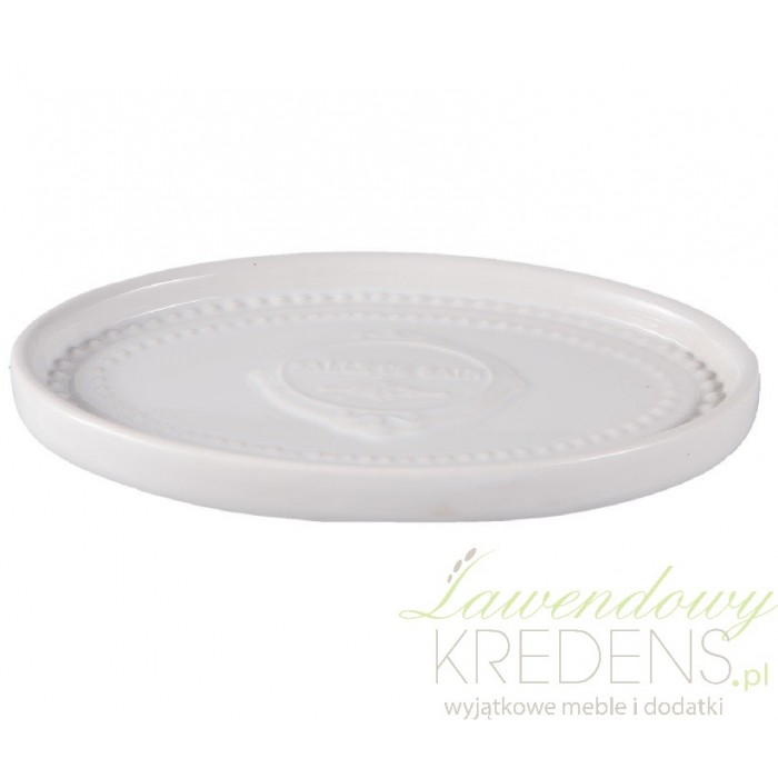 Biała, owalna mydelniczka prowansalska niezbyt głęboka, o wypukłych dekoracjach na dnie.