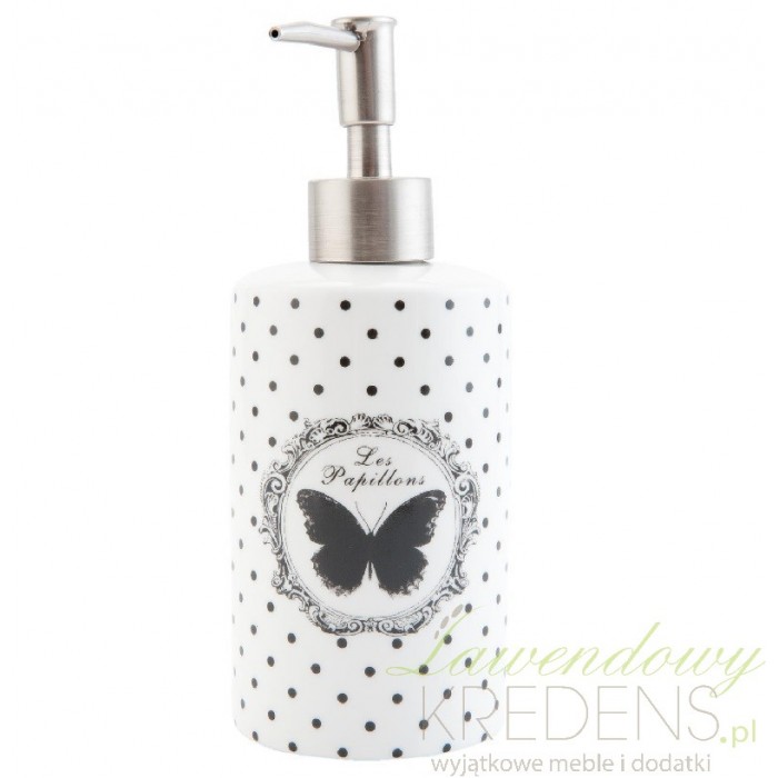 Ceramiczny dozownik do mydła w białym kolorze w czarne kropki z srebrną końcówką. Charakterystyczny dla stylu francuskiego pojemnik został dodatkowo ozdobiony czarnym motylem. Wysoki na 18cm dozownik zastąpi klasyczną kostkę mydła i będzie pięknym dodatkiem w stylowej łazience. Dozownik możesz również umieścić w kuchni i stosować jako podajnik płynu do naczyń.