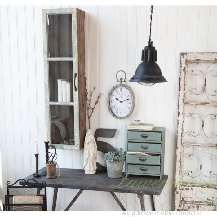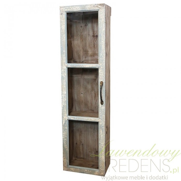 Meble postarzane potrafią zbudować fantastyczny klimat dawnych wnętrz, które kojarzone są dziś ze spokojem i naturalnością. Wysoka i wąska witryna prowansalska z przeszklonymi drzwiami ma wewnątrz dwie praktyczne półki. Drzwi witryny są przedzielone dwoma poziomymi szprosami, pomalowane na szaro i mocno poprzecierane. Witryna ścienna doskonale sprawdzi się jako miejsce na książki w salonie lub na dokumenty w gabinecie.