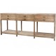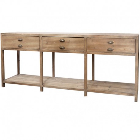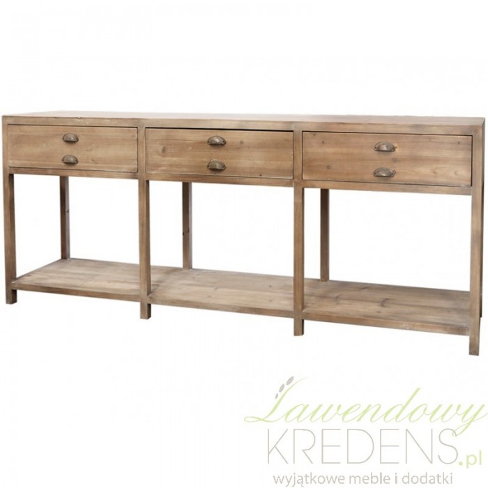 Długa konsola w naturalnym kolorze drewna z trzema szufladami i półką to mebel w stylu industrialnym ustawiony na sześciu prostych nogach.