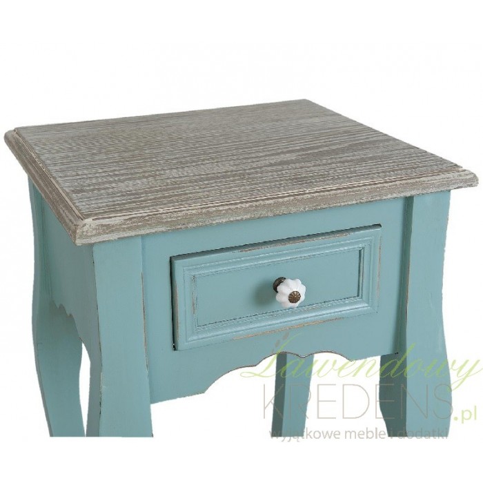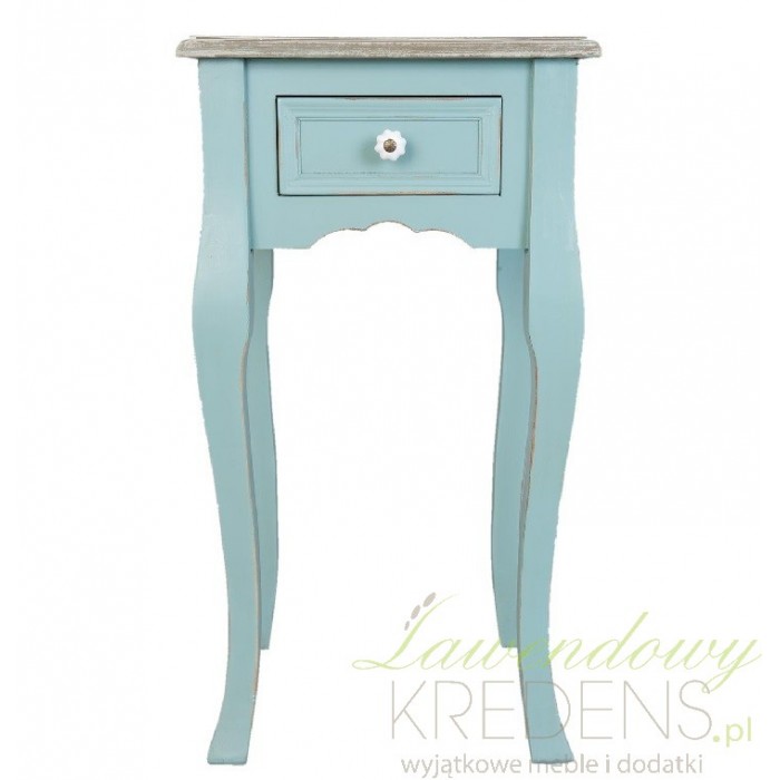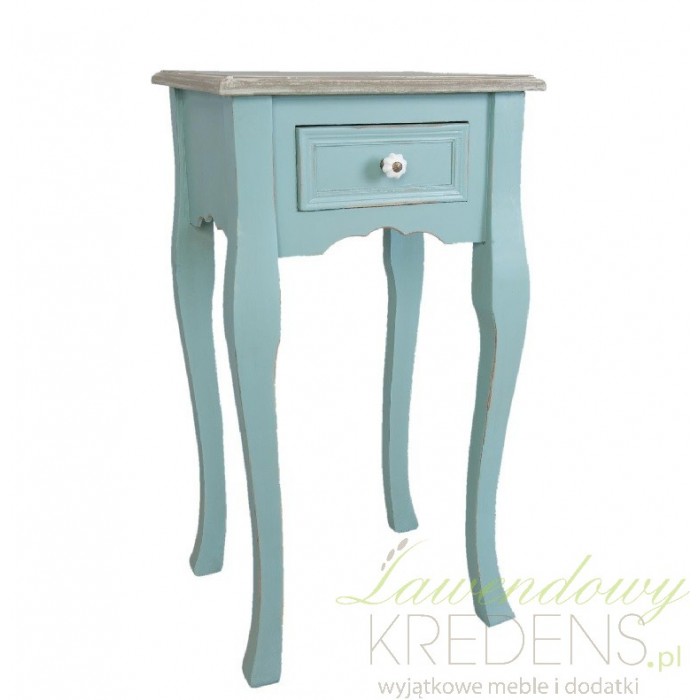 Piękny stolik prowansalski w chłodnym kolorze błękitu z jasnobrązowym blatem z widocznymi słojami. Wyposażony został w szufladkę przez co idealnie sprawdzi się jako funkcjonalny stolik nocny bądź stolik w przedpokoju. Styl prowansalski podkreślają tu subtelnie wygięte nóżki oraz urocze rzeźbienie wykonane pod szufladką. Meble w stylu prowansalskim w pastelowych kolorach wprowadzą do Twojego wnętrza nową energię.