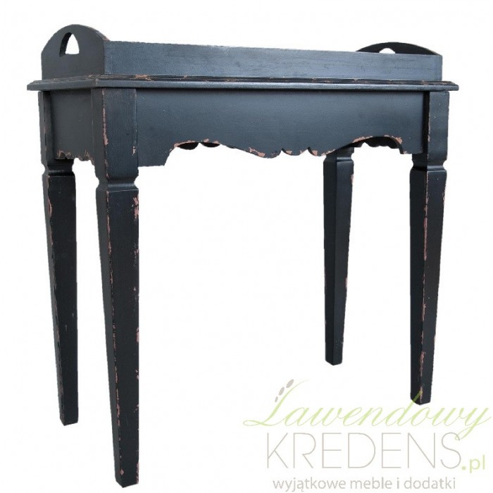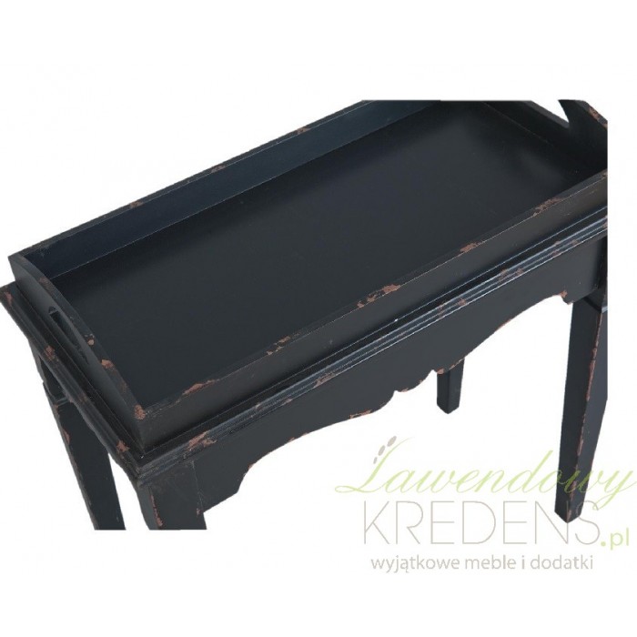 Czarny wspaniale rzeźbiony stolik prowansalski na wysokich prostych nogach i blacie z uchwytami!