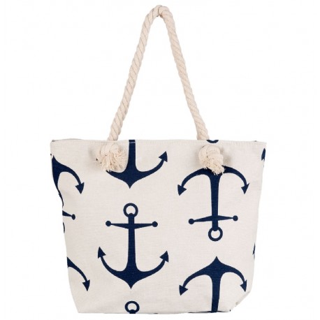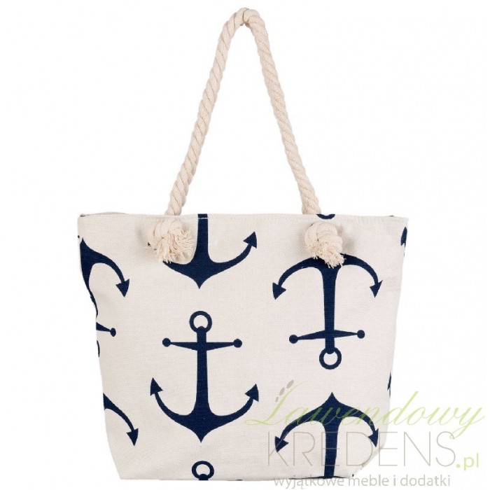 Stylowa torba to niezbędnik podczas każdej, wakacyjnej podróży. Torba plażowa w stylu marynistycznym ma kształt trapezu i dwa grube sznurki do chwytania torby w dłonie lub zawieszenia na ramieniu. Torebka plażowa uszyta została z białego materiału w granatowe kotwice. Marzy Ci się plażowy look? Ta torba to spełnienie marzeń każdej podróżniczki.