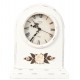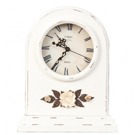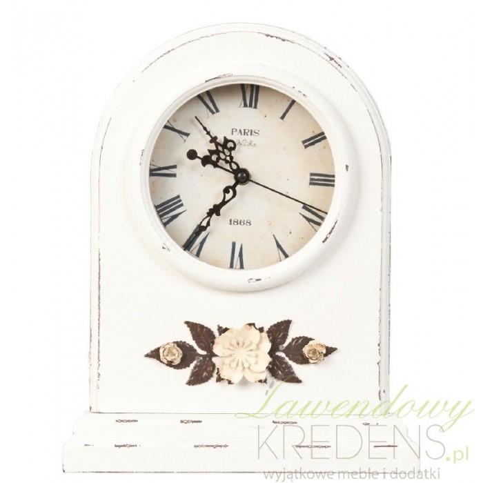 Uroczy zegarek stołowy w białym kolorze to celowo postarzona dekoracja w stylu prowansalskim z odzdobnikami w formie kwiatuszków i listków.