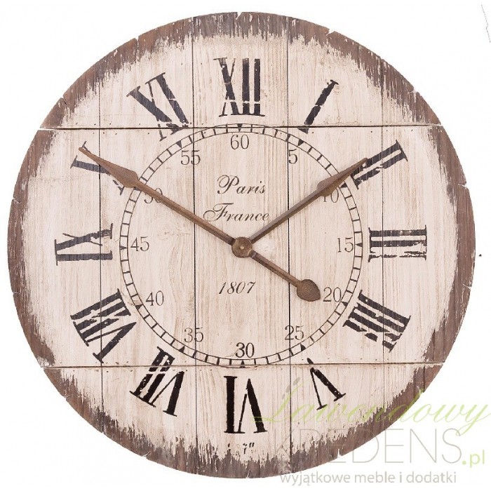 Duży zegar stylu prowansalskim wygląda jak drewniany antyk prosto ze strychu naszych babć. Ten fantastyczny zegar został celowo postarzony przetarciami czarnych cyfr i ozdobiony napisami Paris, France 1807. Godziny wskazywane są przez klasyczne wskazówki w kolorze brązu. Całość bardzo dobrze się ze sobą komponuje i może zdobić zarówno jasne jak i ciemnokolorowe ściany.