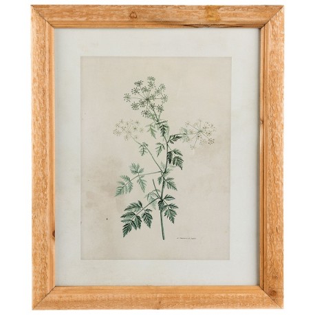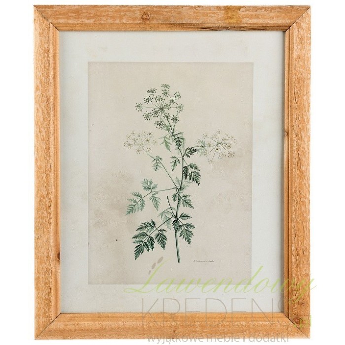 Wyjątkowo uroczy obraz w stylu prowansalskim. Swoim designem i kolorystyką wpisuje się zarówno we wnętrza stylizowane na ciepłe jak również chłodniejsze przestrzenie skandynawskie. Tematem obrazu jest zielony kwiat z drobnym, białym kwiatostanem. Dodatkowej elegancji dodaje mu drewniana rama, przez którą przebijają ciemniejsze słoje.
