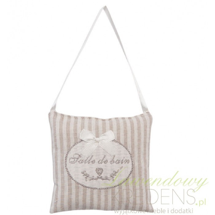 Zawieszka ozdobna wygląda jak mała poduszeczka z wstążka. Ma kształt kwadratu i jest mięciutka, uszyta z brązowego materiału. Z przodu zawieszka ma ozdobne napisy i pasiastą fakturę. Dekoracje w stylu prowansalskim takie jak zawieszki dekoracyjne to świetny dodatek do prezentu lub miły upominek bez okazji.