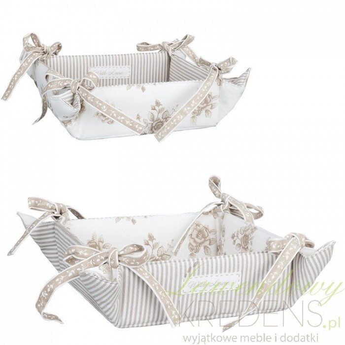 Koszyk na pieczywo to praktyczny pojemnik, którego boki unoszą się do góry poprzez zawiązanie wstążek. Jasny i miękki koszyk możesz zawiązać na dwa sposoby, zostawiając na zewnątrz pasiasty lub kwiatowy materiał. Koszyk prowanslaski uszyto z 100% bawełny. Wybierz do swojej kuchni funkcjonalne dodatki w stylu prowansalskim takie jak koszyki na pieczywo od Clayre&Eef.