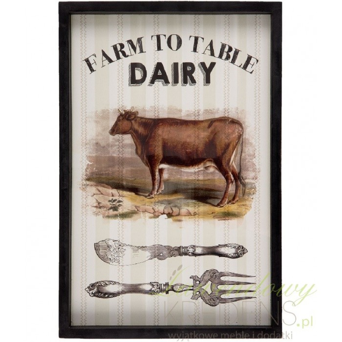 Prostokątny obraz retro jest oprawiony w czarną ramę i przedstawia dumną krowę oraz sztućce.