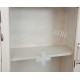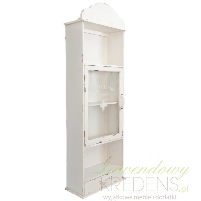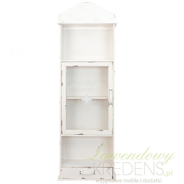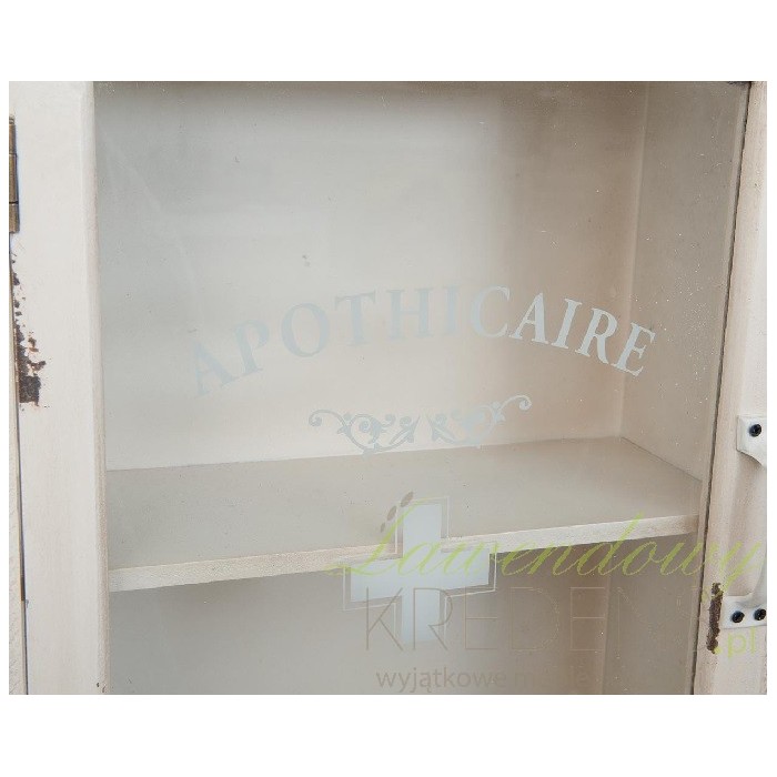 Szafka Shabby Chic została zrobiona z drewna i pomalowana kremową farbą. Z pewnością zwróciłeś uwagę na antyczne przetarcia dodające jej antycznego charakteru. Szafka wygląda jak stara szafka na lekarstwa, niczym ze szpitalnego korytarza z lat 70. Szafka wisząca ma dwie otwarte półki, jedną szufladkę na samym dole i szafkę zamykaną przeszklonymi drzwiami z białym krzyżem.