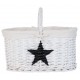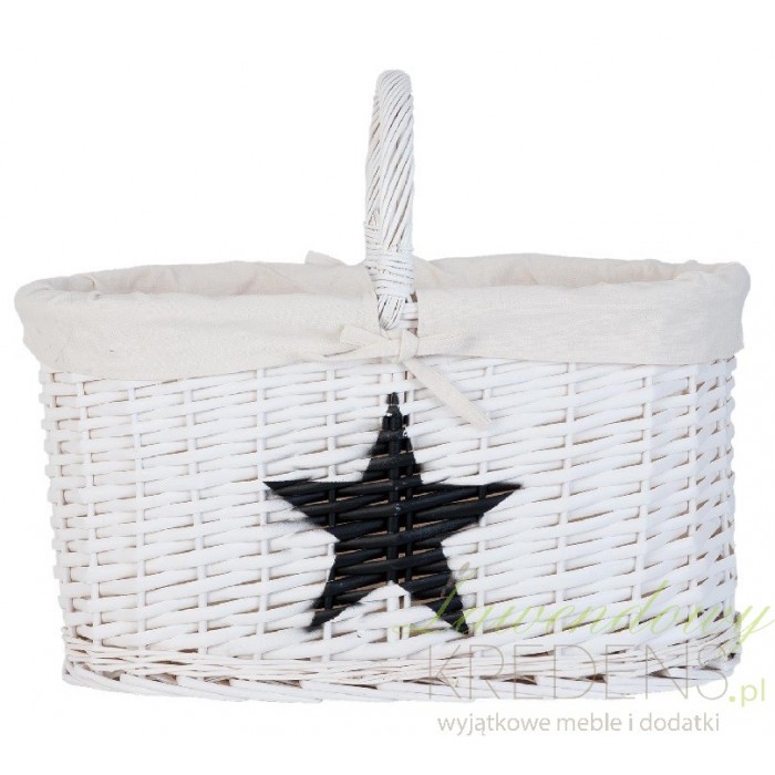Praktyczny kosz wiklinowy z rączka to pleciony kosz z bialej wikliny z czarną gwiazda i kremowym materiałem w środku.