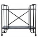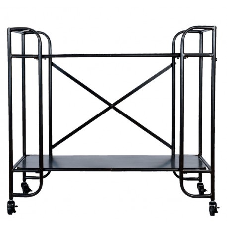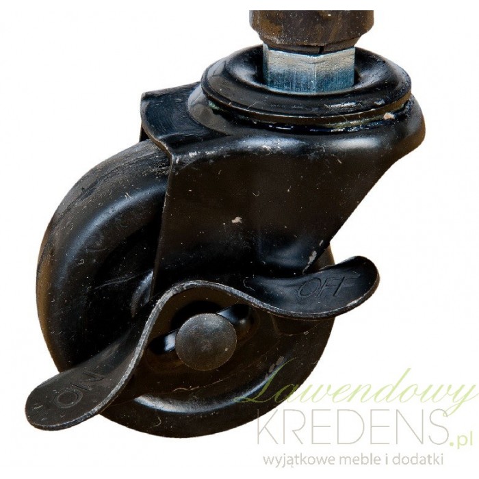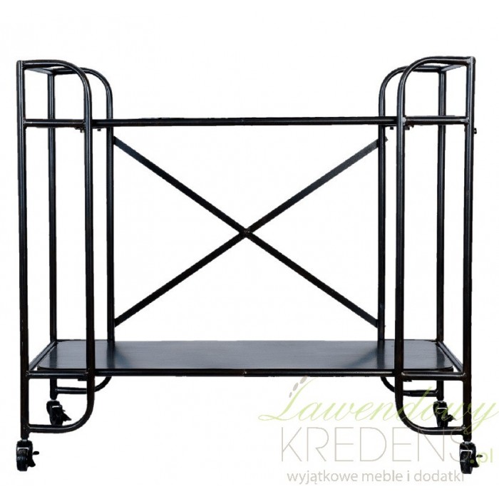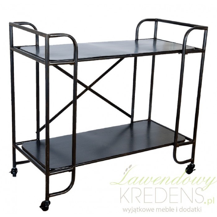 Meble metalowe wybierane są przede wszystkim ze względu na praktyczność i wiele możliwości ich wykorzystania. Stolik industrialny na czterech kółkach możesz wykorzystać jako prostą konsolę do przedpokoju lub jako mebel do restauracji. U dołu znajduje się półka, a tylnia ściana to dwa skrzyżowane w literę X pręty metalowe. Czarny stolik ma matową powierzchnię wzbogaconą o antyczne przetarcia.