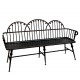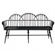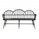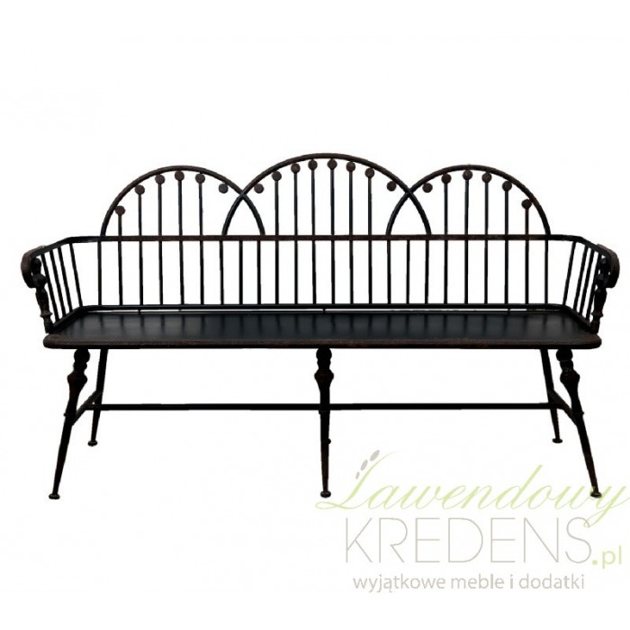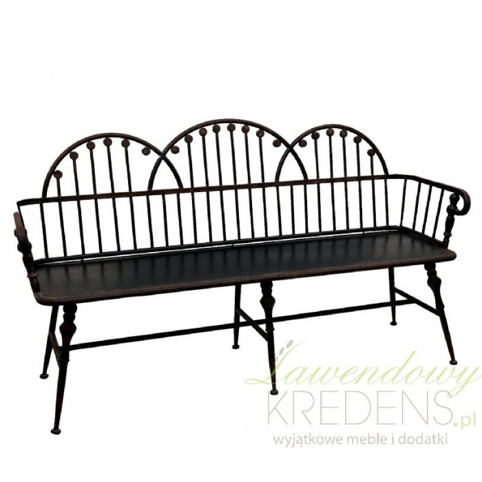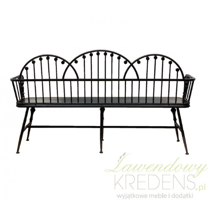 Czarna ławka metalowa została zaprojektowana na styl prowansalski, ma dekoracyjne oparcie i zabudowane siedzisko.