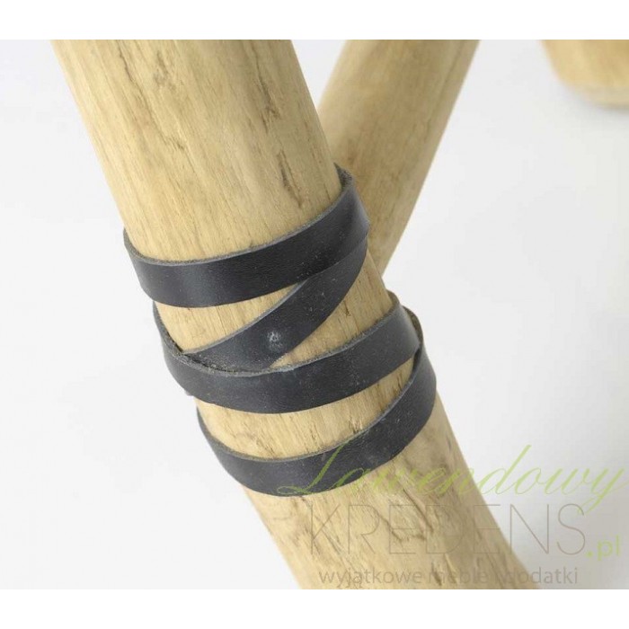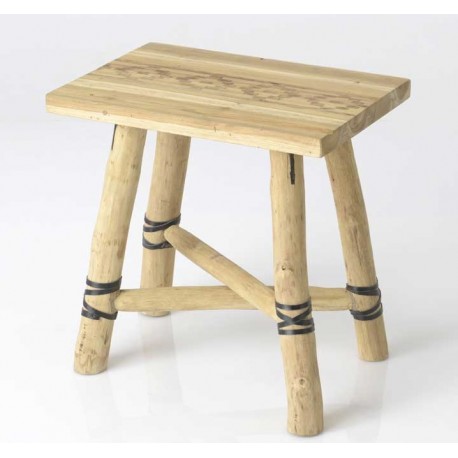 Taboret rustykalny to drewniany mebel z prostokątnym siedziskiem i prostymi nogami, które wzmocnione zostały czarnymi gumkami.
