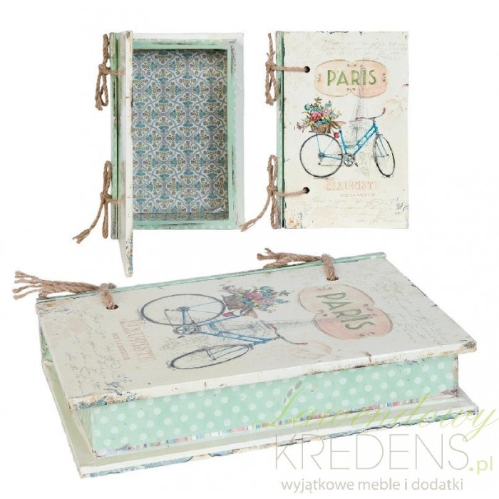 Pudełko książka z grafiką roweru, a także napisem to dodatek prowanslski, który można umieścić na regale pomiędzy naszymi książkami do czytania.