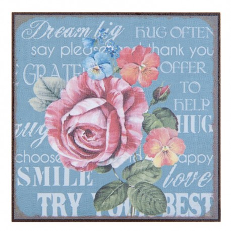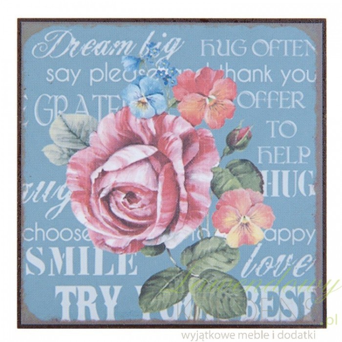 Magnes na lodówkę w stylu prowansalskim prezentuje rozwinięte kwiaty róży w różowym kolorze na niebieskim tle z białymi napisami.