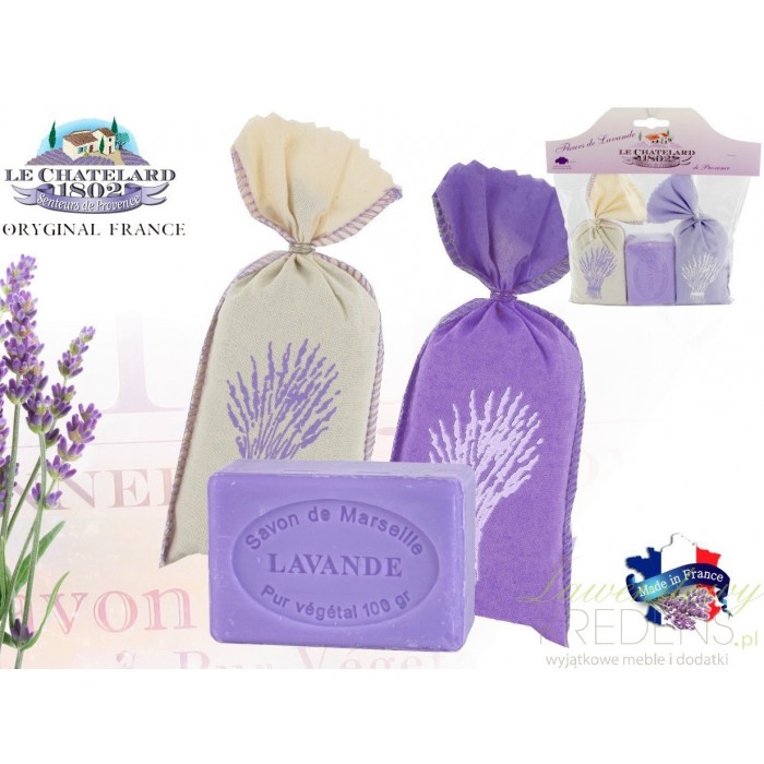 Fioletowe mydło lawendowe oraz lawenda w woreczkach w różnych kolorach firmy Le Chatelard 1802!