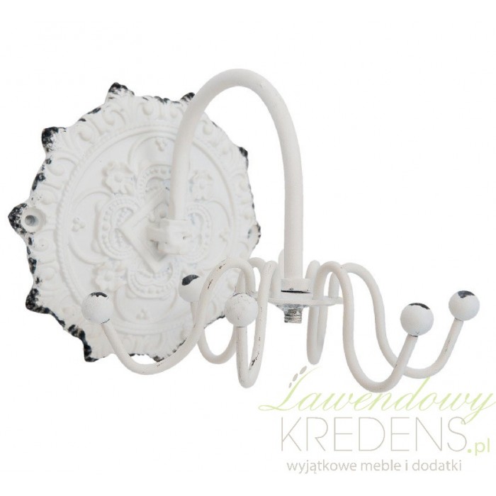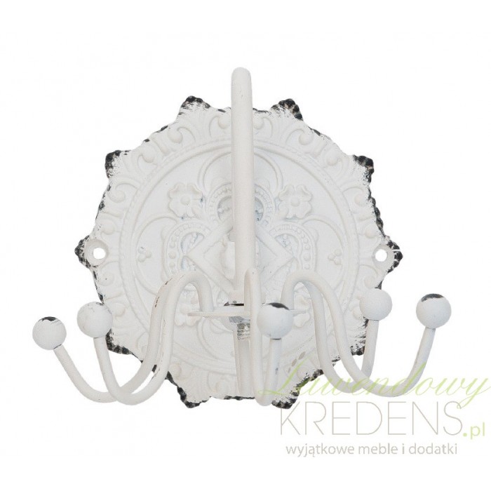 Wieszak w stylu prowansalskim wykonany jest z metal w kolorze białym. Wieszak ozdobny posiada pięć małych wieszaczków na ręczniczki czy ściereczki bądź tez inne ważne rzeczy. Ma mocno przecieraną farbę, zwłaszcza na samych końcach co dodaje mu uroku. Ma świetną dekorację w postaci oryginalnych i unikalnych rysunków. Wieszaki ścienne nadadzą twojemu mieszkaniu niesamowity styl i ponadczasowy wygląd.