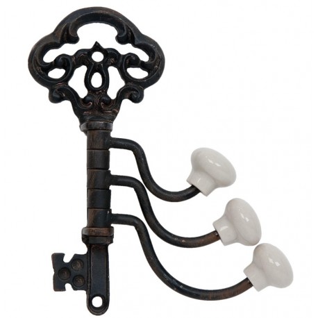 Wieszak vintage uformowany na kształt klucza to wieszak ozdobny z trzema uchwytami wykończonymi białymi gałeczkami.
