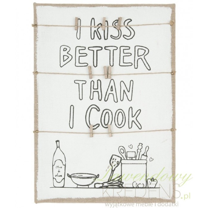 Tablica do kuchni o prostokątnym kształcie, która ma białe tło, a na nim finezyjne napisy oraz grafikę przedstawiającą artykuły kuchenne. Dodatkowo tablica ta posiada trzy sznureczki na których umieszczone są klamerki to których możesz przyczepić na przykład bardzo ważne dla Ciebie przepisy. Dodatki do kuchni z naszego sklepu to nadzwyczajne produkty, z praktycznym wykorzystaniem.