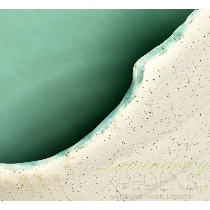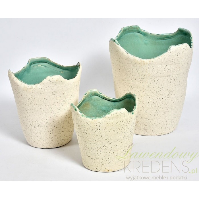 Wazon Belldeco to oryginalna osłonka na donice z kwiatami. Charakteryzuje go falowana i miejscami przebarwiona na turkusowo górna krawędź.