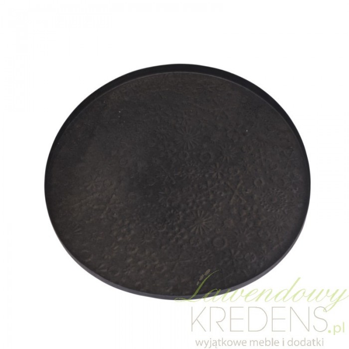 Taca metalowa Chic Antique ma czarny kolor i okrągły kształt. Ma delikatny i przyjemny wzór na spodzie, który jest jej świetną dekoracją. Metalowe tace to także świetny pomysł na oryginalny i wyjątkowy prezent.