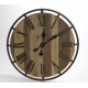 Zegar industrialny ma ciekawe obramowanie, które zrobione jest z metalu i odstaje kilka centymetrów od drewnianej tarczy.