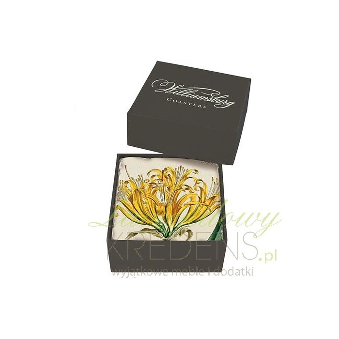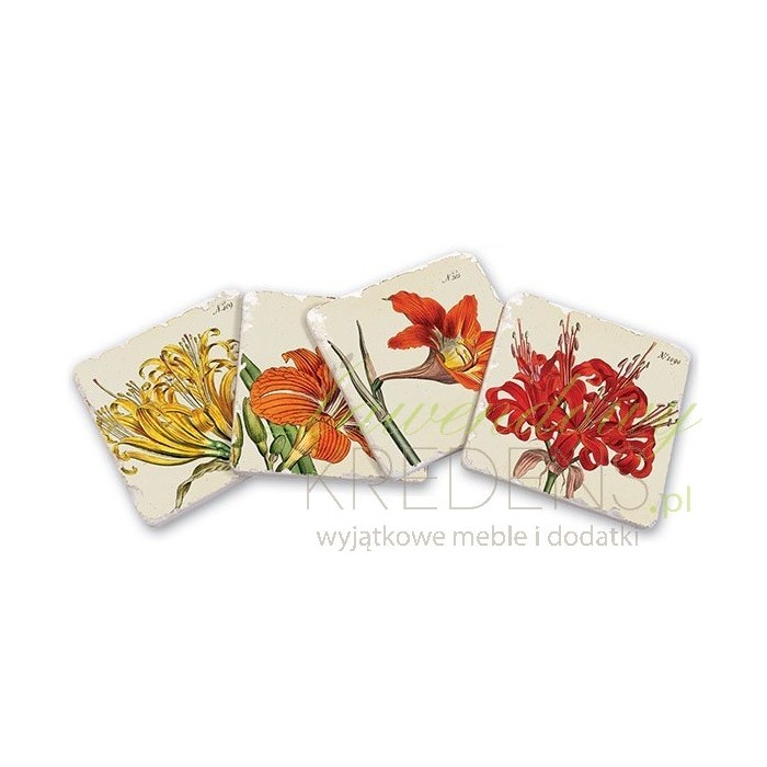Podkładki pod kubek wykonane są z wysokiej jakości kamionki. Są w ilości czterech niepowtarzalnych sztuk, każda z innym prześlicznym kolorowym dużym kwiatem. Wszystkie opakowane są w eleganckie pudełko. Podkładki stołowe mają kwadratowy kształt i są wspaniałą ozdobą kuchni czy jadalni.