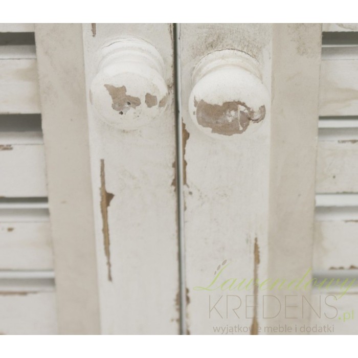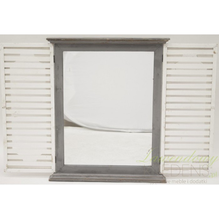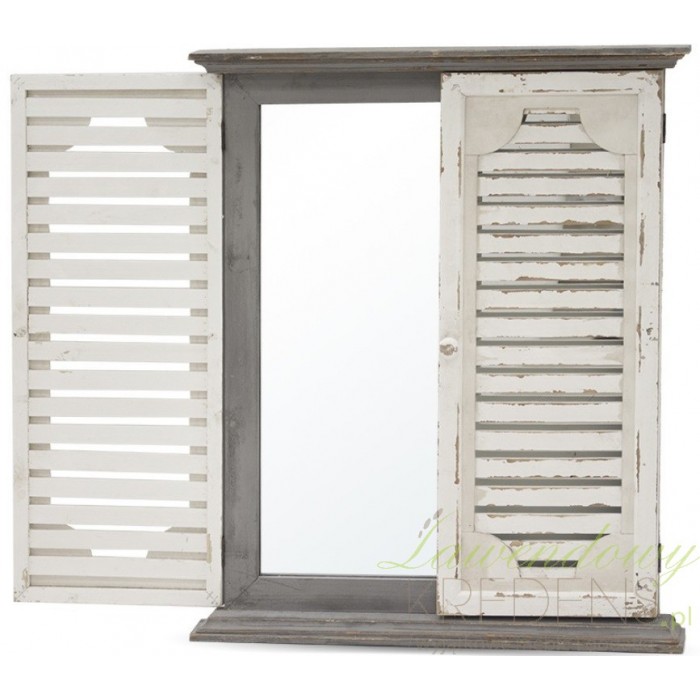 Lustra w stylu prowansalskim takie jak lustro z okiennicami robią spektakularne wrażenie. Lustro okno ma dwa skrzydła z drewnianych deseczek, które wyglądają jak żaluzje. Kremowe, postarzane okiennice interesująco postarzone, efektownie komponują się z ciemnoszarą ramą lustra. W zależności od potrzeb możesz zamknąć okiennice lub otworzyć je na oścież.