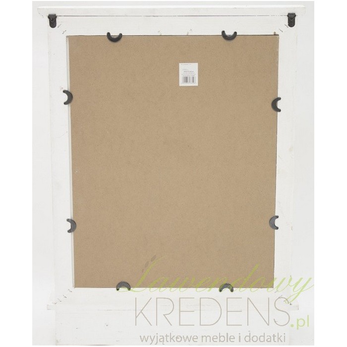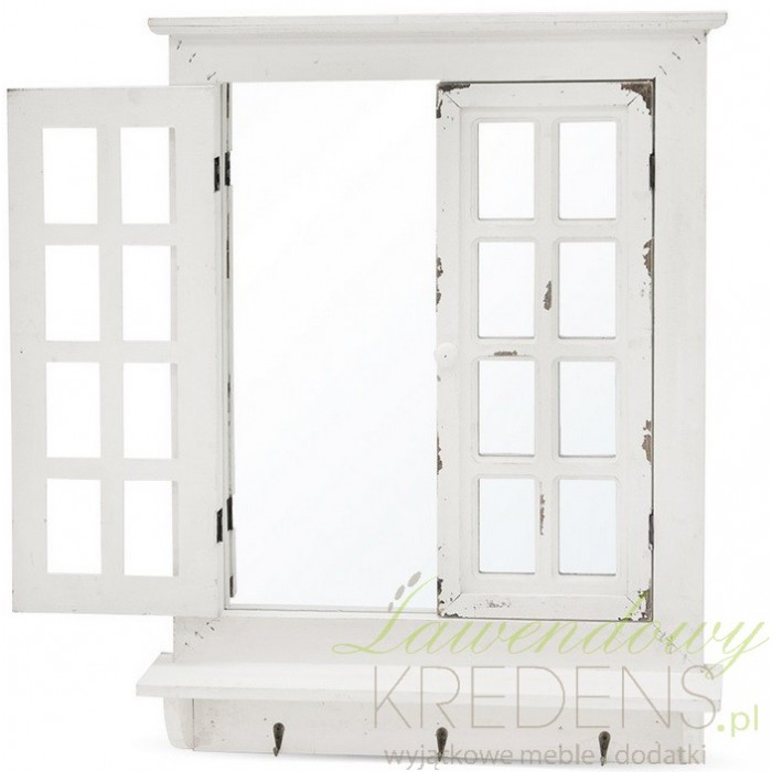 Lustro okno wykonane jest z wysokiej klasy drewna i szkła. Ma prostokątny kształt i biały kolor z licznymi przetarciami. Lustro z okiennicami zamyka się, dzięki czemu wygląda jak okno. Lustra w stylu prowansalskim posiadają cudowne dodatki jak wieszaczki na kurtki czy płaszcze.