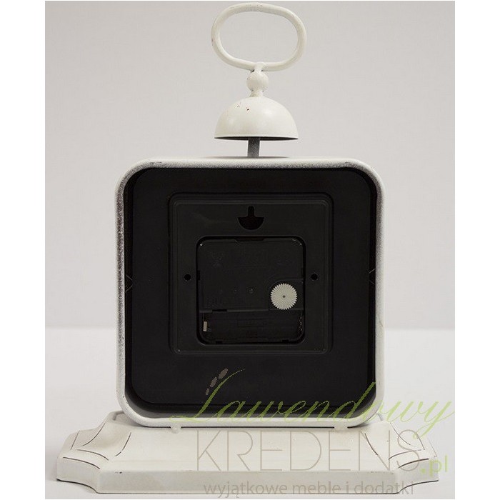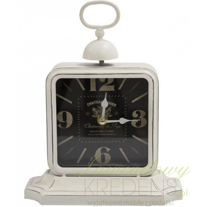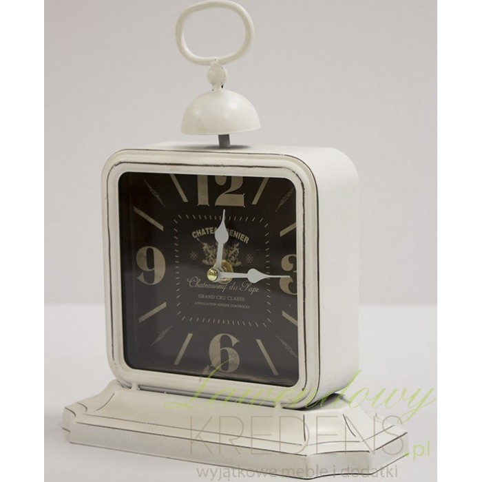 Zegar stołowy ma kwadratowy kształt i stoi na solidnej podstawie. Stojący zegar ma biały kolor i czarną kontrastującą tarczę. Wykonany jest z wysokiej jakości metal i szkła i zdobią go duże arabskie cyfry.
